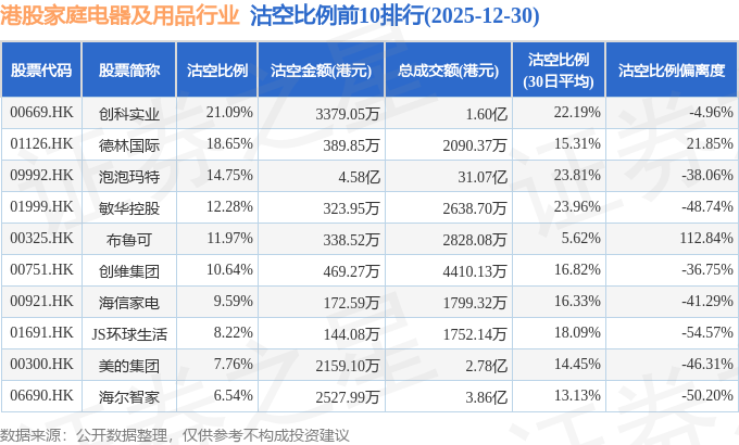 由于港股人民币柜台交易股票成交金额较小,沽空比例普遍偏高,为了避免干扰,已将人民币柜台交易股票从排行表格中剔除。