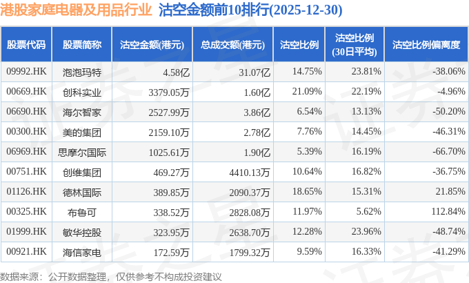 从沽空金额来看,泡泡玛特、创科实业、海尔智家沽空金额位居行业前三,分别为4.58亿港元、3379.05万港元、2527.99万港元。