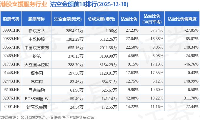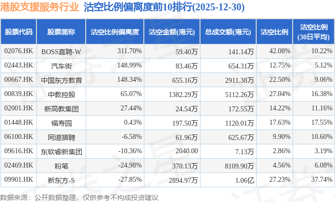 从沽空比例偏离度来看,BOSS直聘-W、汽车街、中国东方教育沽空比例偏离度位居行业前三,分别为311.7%、148.99%、148.34%。