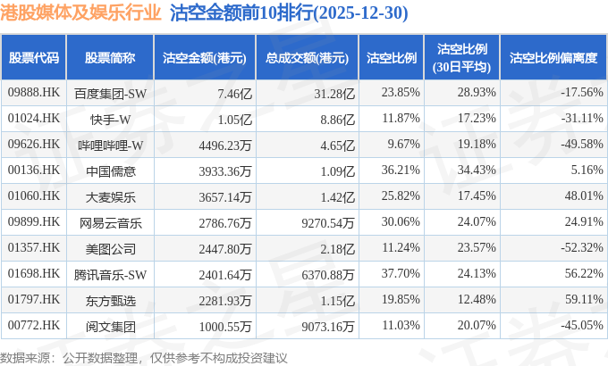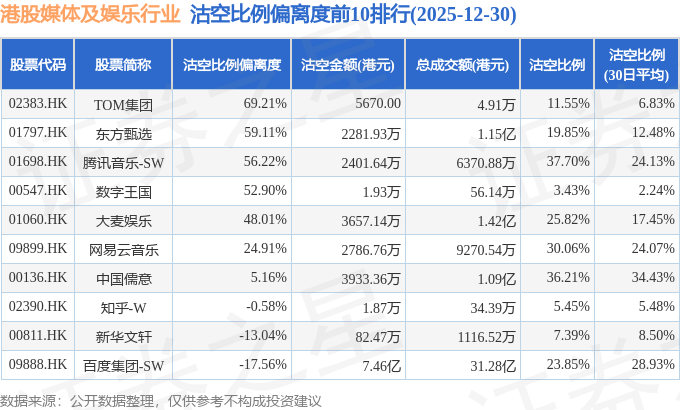 从沽空比例来看,腾讯音乐-SW、中国儒意、网易云音乐沽空比例位居行业前三,分别为37.7%、36.21%、30.06%。