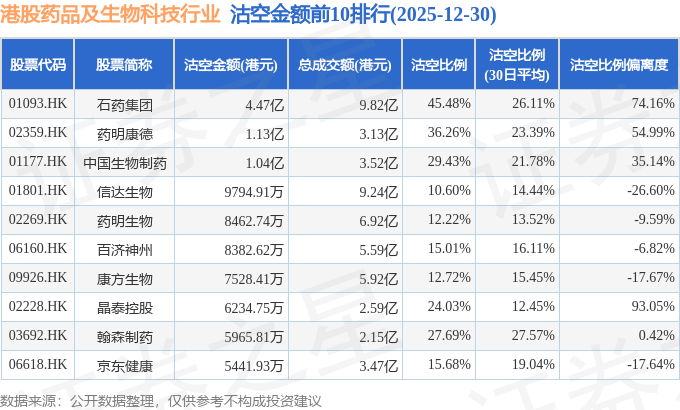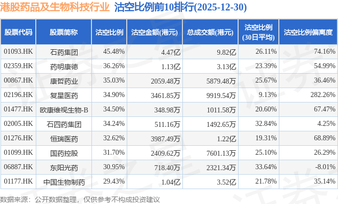 从沽空比例来看,石药集团、药明康德、康哲药业沽空比例位居行业前三,分别为45.48%、36.26%、35.03%。