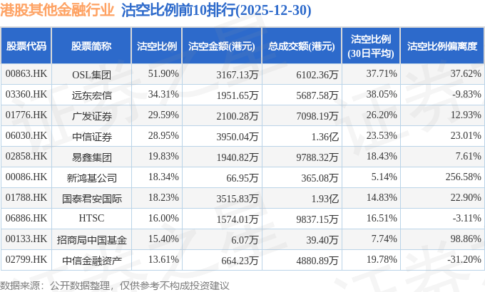 由于港股人民币柜台交易股票成交金额较小,沽空比例普遍偏高,为了避免干扰,已将人民币柜台交易股票从排行表格中剔除。