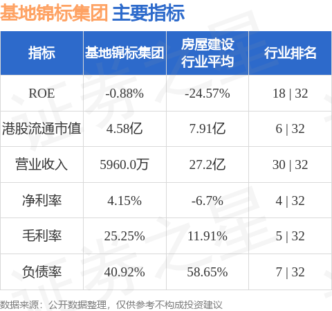 基地锦标集团港股市值4.58亿港元,在房屋建设行业中排名第6。主要指标见下表: