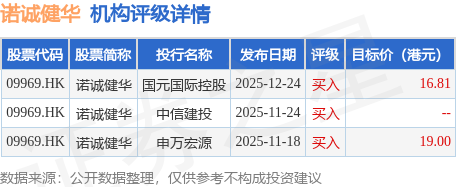 截至2025年12月31日收盘,诺诚健华(09969.HK)报收于12.3港元,下跌0.4%,成交量400.14万股,成交额4895.49万港元。投行对该股的评级以买入为主,近90天内共有3家投行给出买入评级,近90天的目标均价为17.9港元。国元国际控股最新一份研报给予诺诚健华买入评级,目标价16.81港元。