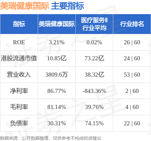 美瑞健康国际港股市值10.85亿港元,在医疗服务Ⅱ行业中排名第24。主要指标见下表: