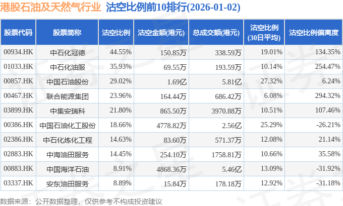 从沽空比例偏离度来看,联合能源集团、中石化油服、中石化冠德沽空比例偏离度位居行业前三,分别为294.32%、254.47%、134.35%。