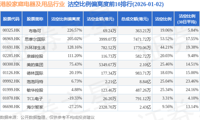 从沽空比例偏离度来看,布鲁可、思摩尔国际、JS环球生活沽空比例偏离度位居行业前三,分别为226.57%、205.02%、128.16%。
