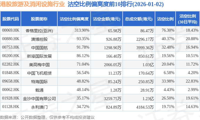 由于港股人民币柜台交易股票成交金额较小,沽空比例普遍偏高,为了避免干扰,已将人民币柜台交易股票从排行表格中剔除。