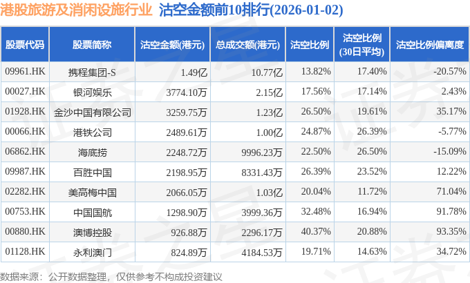 从沽空金额来看,携程集团-S、银河娱乐、金沙中国有限公司沽空金额位居行业前三,分别为1.49亿港元、3774.1万港元、3259.75万港元。