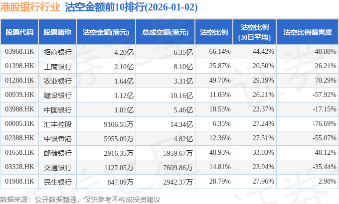 从沽空金额来看,招商银行、工商银行、农业银行沽空金额位居行业前三,分别为4.2亿港元、2.1亿港元、1.64亿港元。