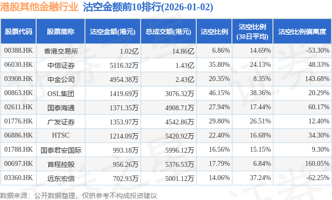 从沽空金额来看,香港交易所、中信证券、中金公司沽空金额位居行业前三,分别为1.02亿港元、5116.32万港元、4954.38万港元。