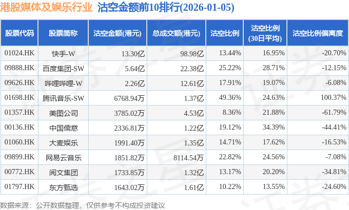 从沽空金额来看,快手-W、百度集团-SW、哔哩哔哩-W沽空金额位居行业前三,分别为13.3亿港元、5.64亿港元、2.26亿港元。