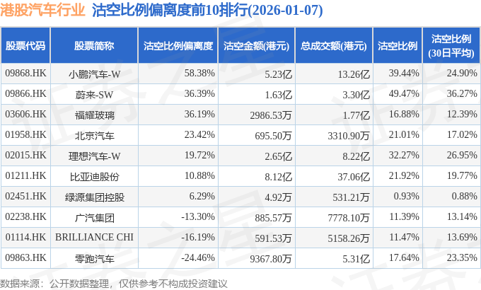 从沽空比例偏离度来看,小鹏汽车-W、蔚来-SW、福耀玻璃沽空比例偏离度位居行业前三,分别为58.38%、36.39%、36.19%。