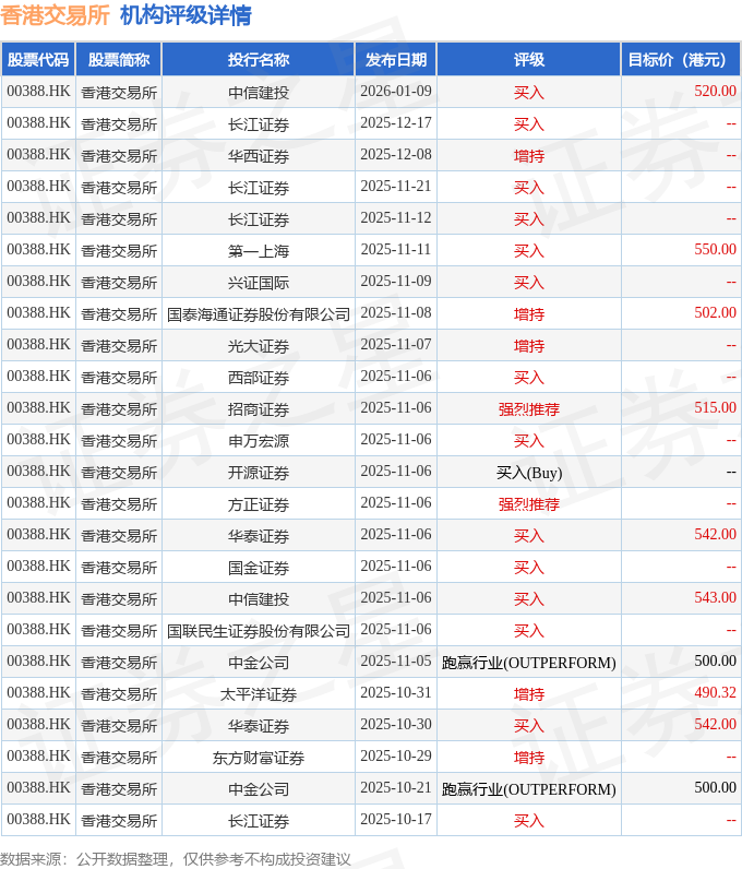投行对该股的评级以买入为主,近90天内共有14家投行给出买入评级,近90天的目标均价为520.43港元。中信建投最新一份研报给予香港交易所买入评级,目标价520港元。