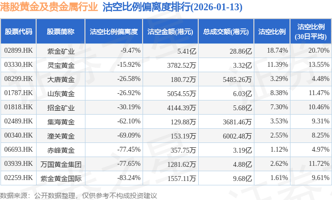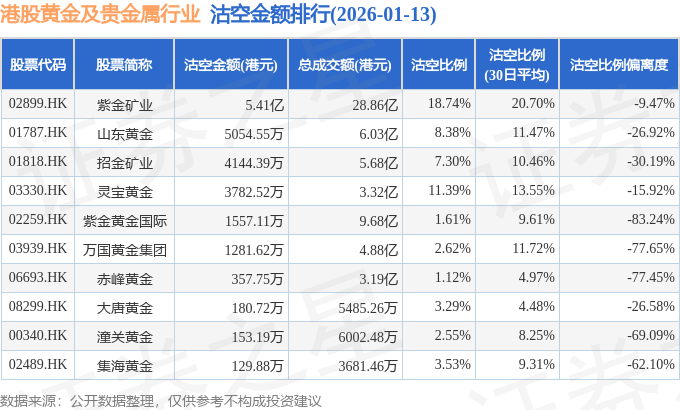 从沽空金额来看,紫金矿业、山东黄金、招金矿业沽空金额位居行业前三,分别为5.41亿港元、5054.55万港元、4144.39万港元。