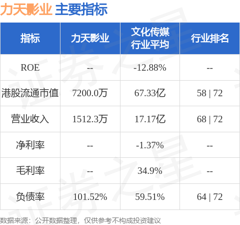 力天影业港股市值7200万港元,在文化传媒行业中排名第58。主要指标见下表: