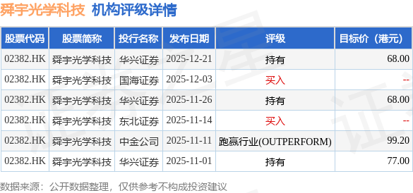 截至2026年1月14日收盘,舜宇光学科技(02382.HK)报收于64.75港元,下跌0.46%,成交量1285.98万股,成交额8.38亿港元。投行对该股的评级以持有为主,近90天内共有3家投行给出持有评级,近90天的目标均价为78.05港元。华兴证券最新一份研报给予舜宇光学科技持有评级,目标价68港元。