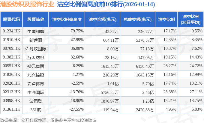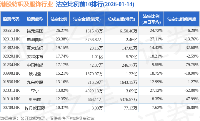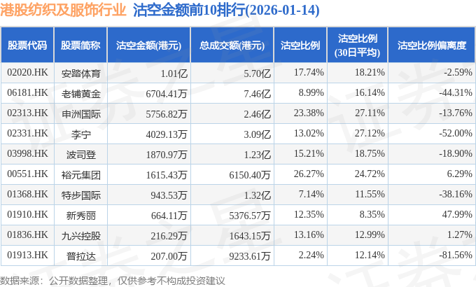 从沽空金额来看,安踏体育、老铺黄金、申洲国际沽空金额位居行业前三,分别为1.01亿港元、6704.41万港元、5756.82万港元。