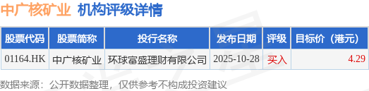 截至2026年1月15日收盘,中广核矿业(01164.HK)报收于3.64港元,上涨1.68%,成交量1.0亿股,成交额3.68亿港元。投行对该股的评级以买入为主,近90天内共有1家投行给出买入评级,近90天的目标均价为4.29港元。环球富盛理财有限公司最新一份研报给予中广核矿业买入评级,目标价4.29港元。