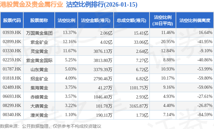 从沽空比例来看,万国黄金集团、紫金矿业、灵宝黄金沽空比例位居行业前三,分别为13.37%、12.16%、11.67%。