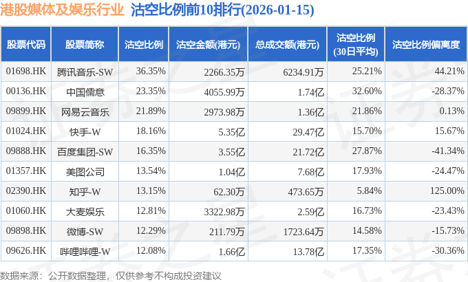 从沽空比例来看,腾讯音乐-SW、中国儒意、网易云音乐沽空比例位居行业前三,分别为36.35%、23.35%、21.89%。