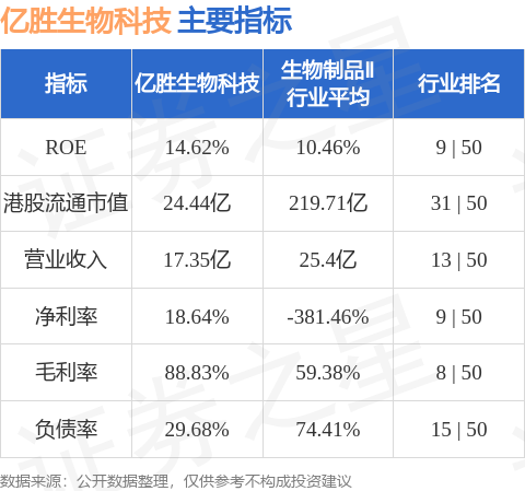 亿胜生物科技港股市值24.44亿港元,在生物制品Ⅱ行业中排名第31。主要指标见下表: