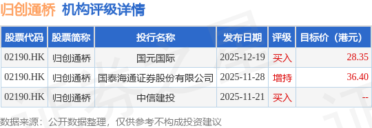 投行对该股的评级以买入为主,近90天内共有2家投行给出买入评级,近90天的目标均价为32.38港元。国元国际最新一份研报给予归创通桥买入评级,目标价28.35港元。
