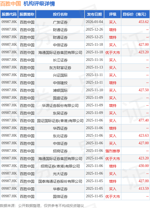 投行对该股的评级以买入为主,近90天内共有13家投行给出买入评级,近90天的目标均价为432.1港元。广发证券最新一份研报给予百胜中国买入评级,目标价453.62港元。