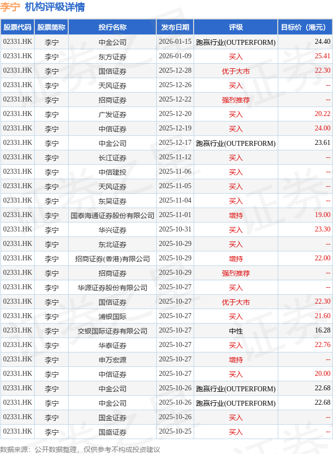 投行对该股的评级以买入为主,近90天内共有18家投行给出买入评级,近90天的目标均价为22.11港元。国盛证券最新一份研报给予李宁买入评级。