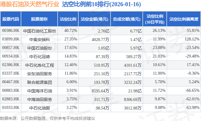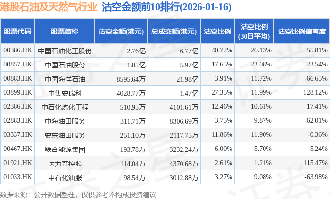 从沽空金额来看,中国石油化工股份、中国石油股份、中国海洋石油沽空金额位居行业前三,分别为2.76亿港元、1.05亿港元、8595.64万港元。