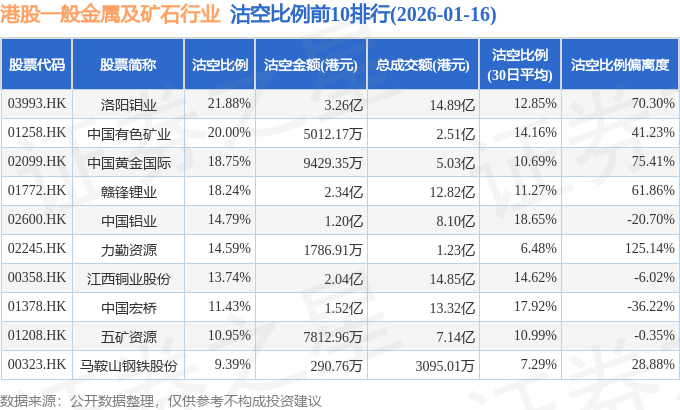 从沽空金额来看,洛阳钼业、赣锋锂业、江西铜业股份沽空金额位居行业前三,分别为3.26亿港元、2.34亿港元、2.04亿港元。