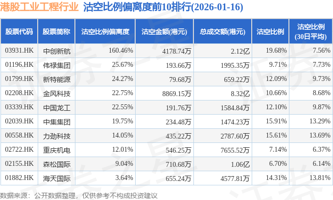 从沽空比例偏离度来看,中创新航、伟禄集团、新特能源沽空比例偏离度位居行业前三,分别为160.46%、25.67%、24.27%。