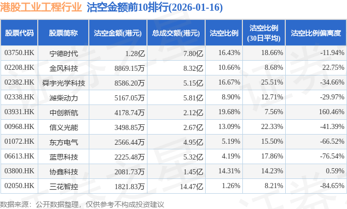 从沽空金额来看,宁德时代、金风科技、舜宇光学科技沽空金额位居行业前三,分别为1.28亿港元、8869.15万港元、8586.2万港元。