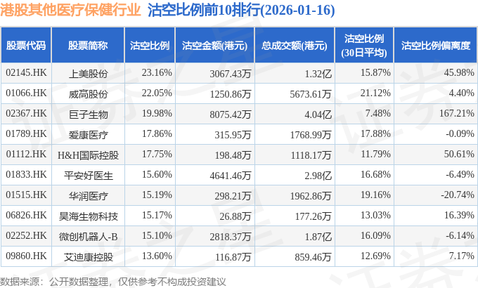 证券之星消息,1月16日港交所披露数据显示,当日港股其他医疗保健行业的126只个股中有36只被沽空,总沽空股数为1663.71万股,总沽空金额为2.78亿元(港元),而当日其他医疗保健行业的总成交金额为26.86亿元(港元),沽空比例为10.34%。当日其他医疗保健行业总体跌0.1%。
