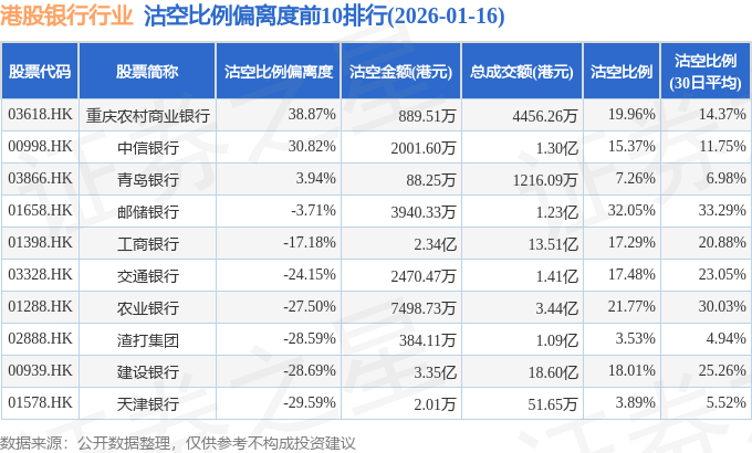 从沽空比例偏离度来看,重庆农村商业银行、中信银行、青岛银行沽空比例偏离度位居行业前三,分别为38.87%、30.82%、3.94%。