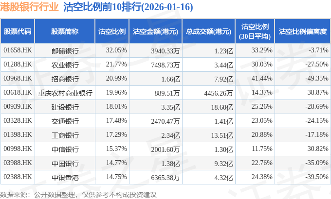 从沽空比例来看,邮储银行、农业银行、招商银行沽空比例位居行业前三,分别为32.05%、21.77%、20.99%。