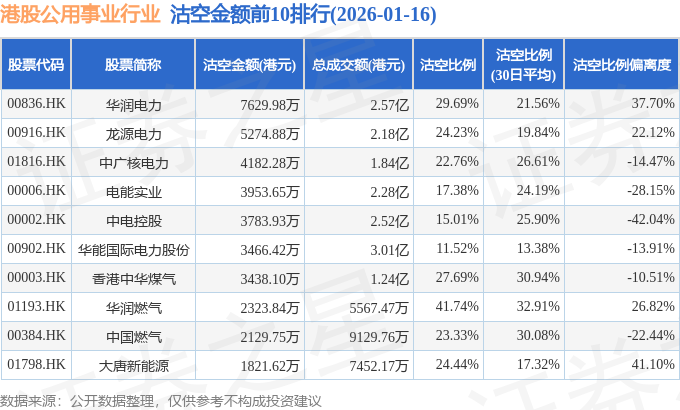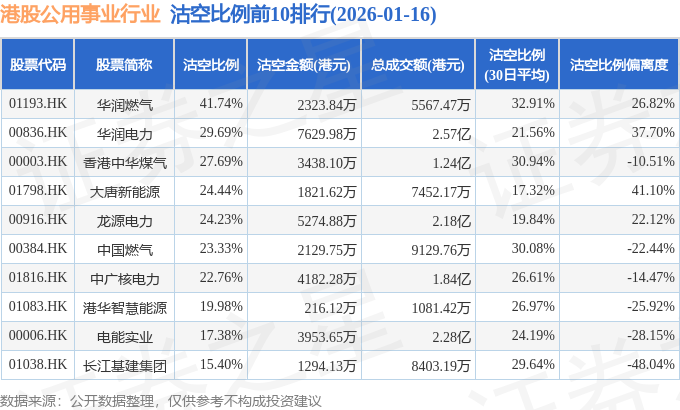 从沽空比例来看,华润燃气、华润电力、香港中华煤气沽空比例位居行业前三,分别为41.74%、29.69%、27.69%。
