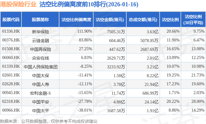 从沽空比例偏离度来看,新华保险、云锋金融、中国再保险沽空比例偏离度位居行业前三,分别为111.9%、83.86%、27.25%。