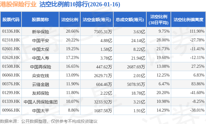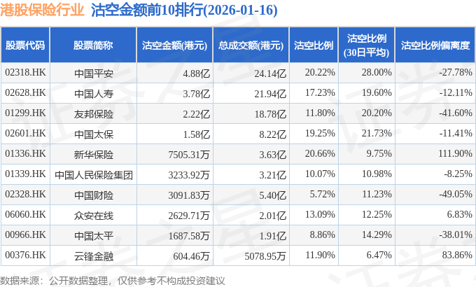 从沽空金额来看,中国平安、中国人寿、友邦保险沽空金额位居行业前三,分别为4.88亿港元、3.78亿港元、2.22亿港元。