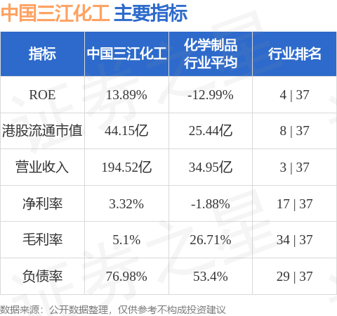 中国三江化工港股市值44.15亿港元,在化学制品行业中排名第8。主要指标见下表: