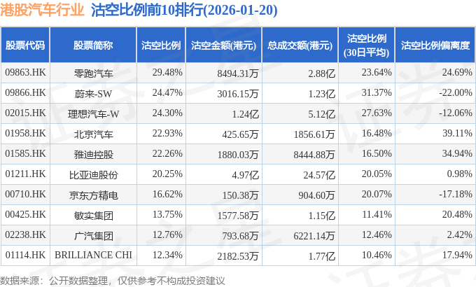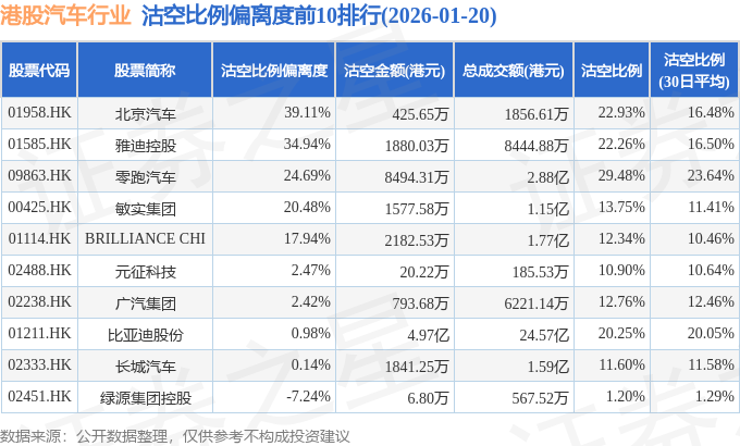 从沽空比例偏离度来看,北京汽车、雅迪控股、零跑汽车沽空比例偏离度位居行业前三,分别为39.11%、34.94%、24.69%。