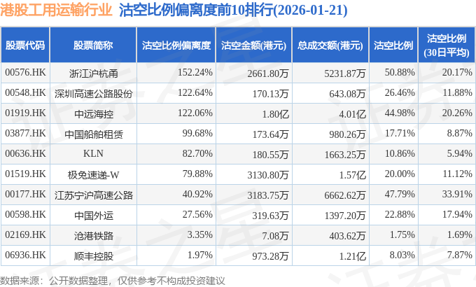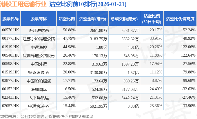 从沽空比例来看,浙江沪杭甬、江苏宁沪高速公路、中远海控沽空比例位居行业前三,分别为50.88%、47.79%、44.98%。