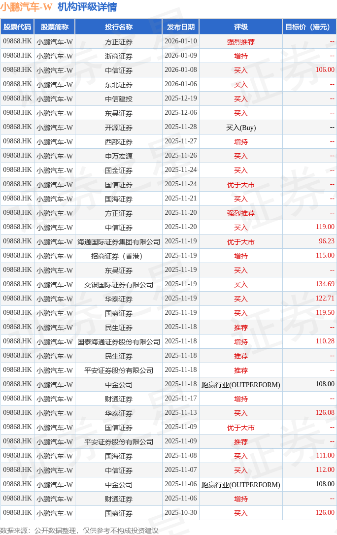 投行对该股的评级以买入为主,近90天内共有16家投行给出买入评级,近90天的目标均价为115.32港元。方正证券最新一份研报给予小鹏汽车-W强烈推荐评级。