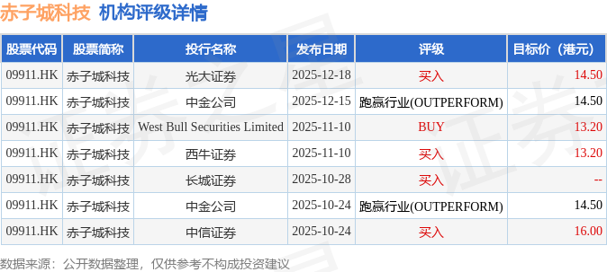 投行对该股的评级以买入为主,近90天内共有4家投行给出买入评级,近90天的目标均价为14.32港元。光大证券最新一份研报给予赤子城科技买入评级,目标价14.5港元。