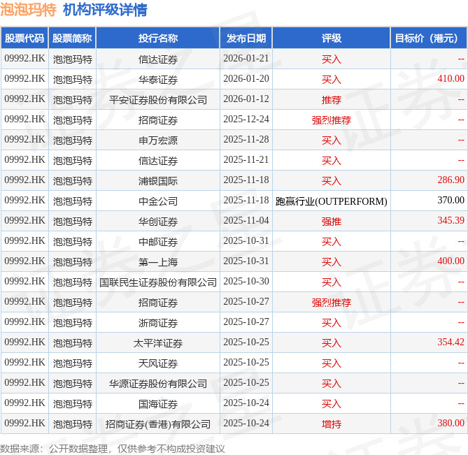 投行对该股的评级以买入为主,近90天内共有14家投行给出买入评级,近90天的目标均价为363.82港元。浙商证券最新一份研报给予泡泡玛特买入评级。
