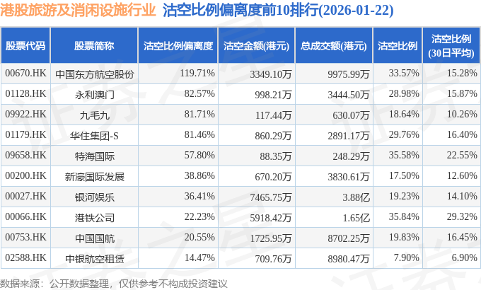 从沽空比例偏离度来看,中国东方航空股份、永利澳门、九毛九沽空比例偏离度位居行业前三,分别为119.71%、82.57%、81.71%。