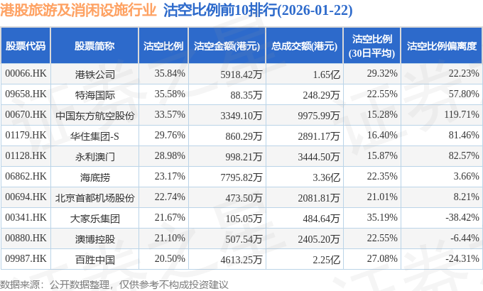 从沽空比例来看,港铁公司、特海国际、中国东方航空股份沽空比例位居行业前三,分别为35.84%、35.58%、33.57%。