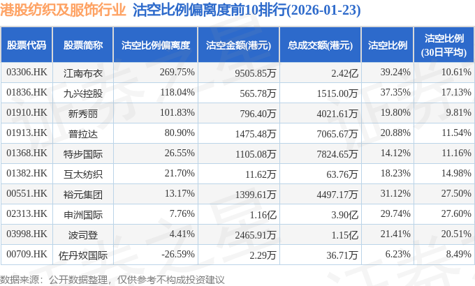 从沽空比例偏离度来看,江南布衣、九兴控股、新秀丽沽空比例偏离度位居行业前三,分别为269.75%、118.04%、101.83%。