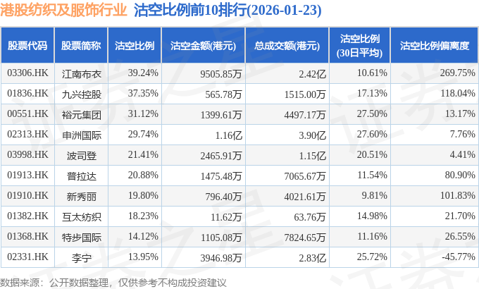 从沽空比例来看,江南布衣、九兴控股、裕元集团沽空比例位居行业前三,分别为39.24%、37.35%、31.12%。