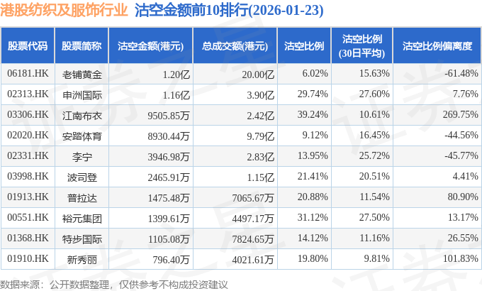 从沽空金额来看,老铺黄金、申洲国际、江南布衣沽空金额位居行业前三,分别为1.2亿港元、1.16亿港元、9505.85万港元。
